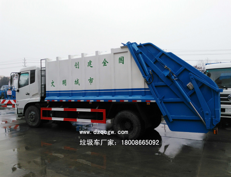 底盤(pán)說(shuō)明:東風(fēng)天錦排半可前翻駕駛室,4700mm軸距,ISB180-40康機(jī)180馬力柴油共軌國(guó)四發(fā)動(dòng)機(jī),4.5噸前橋,9噸后橋,東風(fēng)6檔變速箱,9.00R20鋼絲胎,帶空調(diào),ABS。 上裝說(shuō)明: 廂體材料為武鋼優(yōu)質(zhì)炭鋼,厚度為邊5mm,廂體容積為14立方米。由裝料機(jī)構(gòu)、壓縮機(jī)構(gòu)、卸料機(jī)構(gòu)、油泵、油箱、控制閥等組成的液壓機(jī)構(gòu)組成。裝料機(jī)構(gòu)由支架、連桿機(jī)構(gòu)、凸輪、掛鉤等組成,在油缸作用下,將垃圾桶內(nèi)的垃圾自動(dòng)翻轉(zhuǎn)倒入料斗內(nèi)。新款有9支液壓缸制動(dòng),不帶副壓板,液壓控制操作系統(tǒng)為電動(dòng)控制和手動(dòng)控制。 后翻轉(zhuǎn)機(jī)構(gòu)選裝:1、掛桶翻轉(zhuǎn)機(jī)構(gòu)(可選帶鐵桶或塑料桶),手動(dòng)及電控操作 2、簸箕斗翻轉(zhuǎn)機(jī)構(gòu) 3、擺臂式翻轉(zhuǎn)機(jī)構(gòu) |