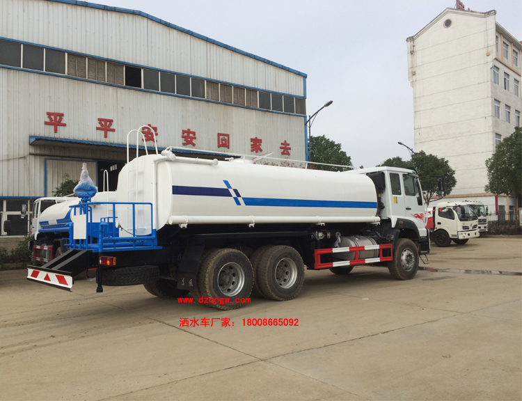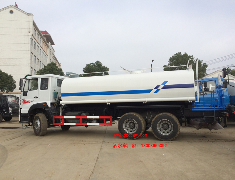 底盤說明:重汽斯太爾后雙橋底盤,重汽280馬力國五發(fā)動機(jī),HOWO 10檔變速箱,153前后橋,4350+1350mm軸距,11.00R20鋼絲胎,帶空調(diào),ABS.罐體有效容積:14.7立方米。 專用功能:該多功能灑水車適合于各種路面的灑水、噴霧、降溫、除塵、沖洗塵埃臟物,亦可用于園林綠化、市政環(huán)衛(wèi)、路面養(yǎng)護(hù)及應(yīng)急消防、運(yùn)輸飲用水等。專用部分由罐體、水泵、球閥、輸水管道、灑水裝置等部件組成。水泵、取力箱、球閥均為國家定型產(chǎn)品,具有性能良好,工作可靠、壓力高、流量大、油耗低等特點(diǎn)。 改裝部分:標(biāo)配前沖、后灑、側(cè)噴、工作平臺、綠化高炮、自流閥、消防接口,輸水管3米2根,8噸以上罐體帶高位花灑2個(gè),億豐泵或金龍泵,控制方式為手動。選裝氣動閥門控制;高位花灑,大鴨嘴,藥盤,罐體側(cè)面加裝萬向可調(diào)節(jié)噴頭,罐體后部壓塵噴灑裝置,兩個(gè)圓警燈或長警燈,LED箭頭燈,泵可選裝威龍泵或農(nóng)藥噴霧裝置。 |